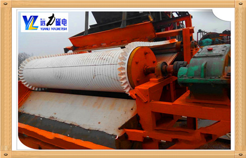 2、矿粒经输送带被送入上磁辊分选,由于铁矿的矿粒有磁性,立即被强磁场吸附在磁辊上,脉石粒由于没有磁性,磁辊的强磁对它不产生吸力,随着磁辊的转动,矿粒一直被吸在磁辊上,而脉石粒在磁辊转到前端位置时被抛出掉在隔矿板的前面,矿粒继续被磁辊带到脱磁区时自动掉入一选集矿斗收集为精矿成品。