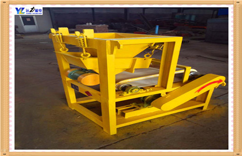 2、矿粒经输送带被送入上磁辊分选,由于铁矿的矿粒有磁性,立即被强磁场吸附在磁辊上,脉石粒(杂石、砂土)由于没有磁性(磁性很弱),磁辊的强磁对它不产生吸力,随着磁辊的转动,矿粒一直被吸在磁辊上,而脉石粒在磁辊转到前端位置时被抛出掉在隔矿板的前面(通过改变隔矿板角度的大小可调整精矿的品位),矿粒继续被磁辊带到脱磁区时自动掉入一选集矿斗收集为精矿成品。